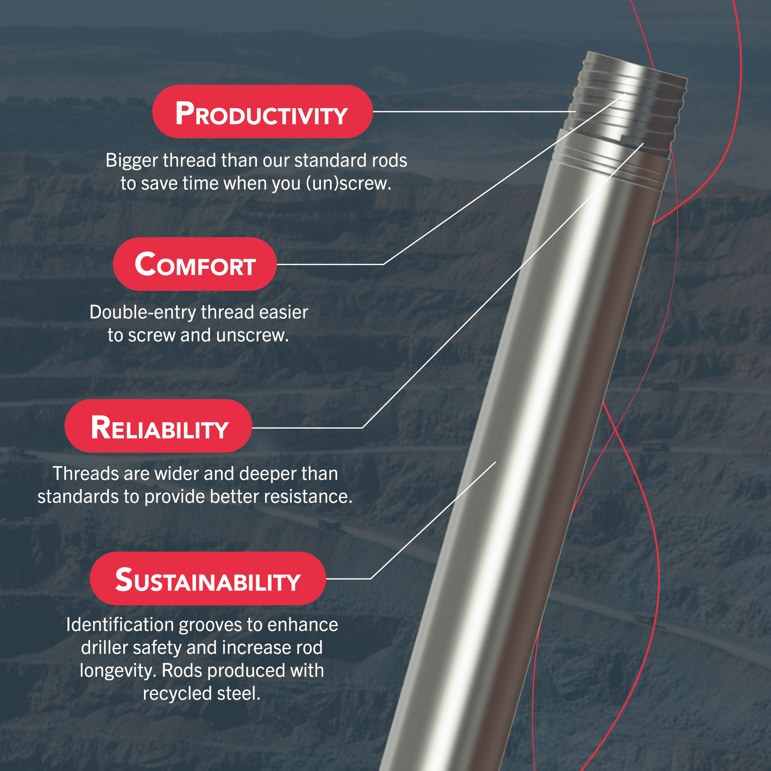 • +38% Tensile Strength: This improvement at the breaking point ensures the rods can support the weight of long drill strings in both vertical and horizontal applications.