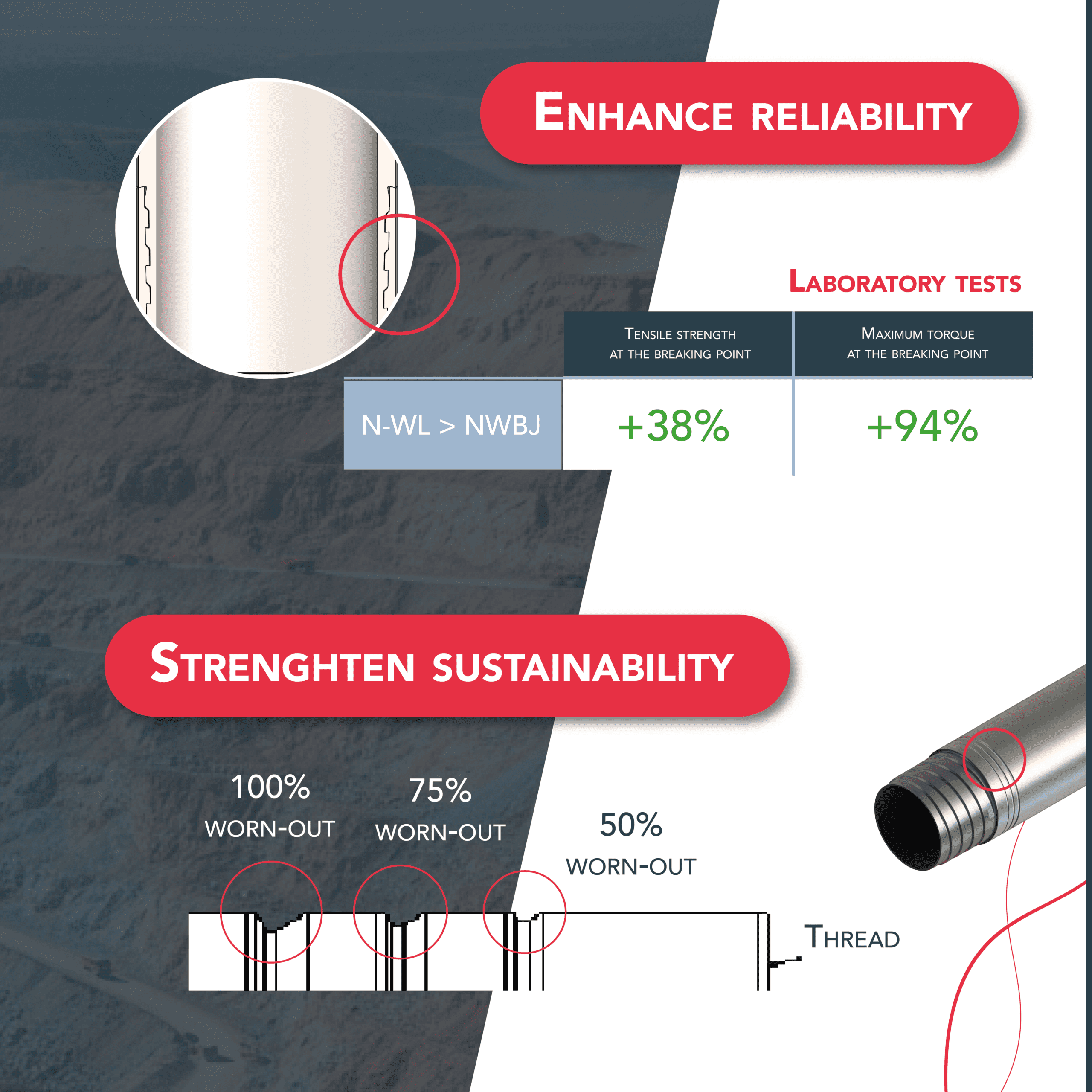 • Bigger Thread Pitch: The NWBJ thread features a larger pitch than standard rods, allowing for significantly faster connection and disconnection.